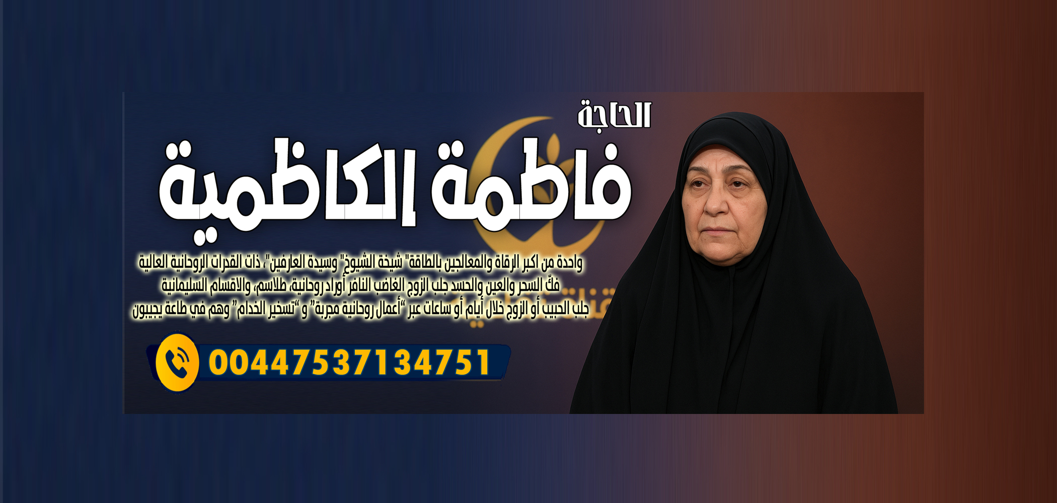 الحاجة فاطمة الكاظمية الشيخة الروحانية واحدة من اكـبر الرقاة والمعالجين بالطاقة 00447537134751